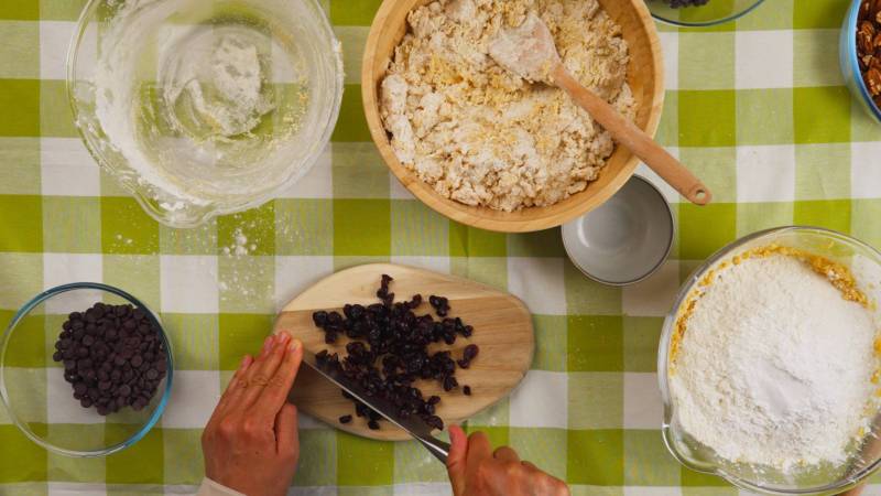 Die Cranberries und Pekannüsse hacken. Den Teig in zwei große Schüsseln aufteilen. In eine Schüssel die Schokoladenstückchen und Pekannüsse geben und unterheben. In die andere Schüssel die Cranberries, weißen Schokoladenstückchen und dunklen Schokoladenstückchen geben und unterheben.