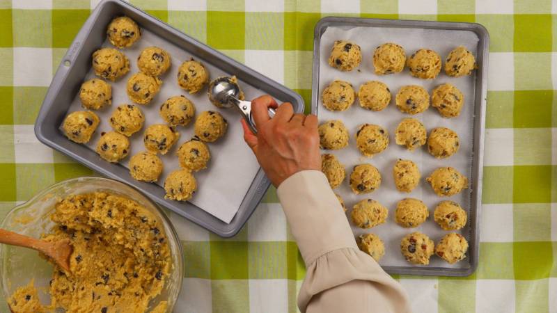Portioniere den Keksteig mit einem Eisportionierer und lege die Portionen auf ein mit Backpapier ausgelegtes Backblech. Stelle den Teig für 1 bis 2 Stunden in den Kühlschrank.