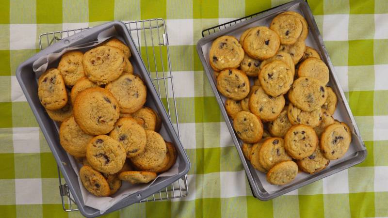 Heiz den Ofen auf 175 °C vor. Leg die Kekse mit genug Abstand zueinander auf das Backblech und back sie 14 Minuten lang oder bis sie leicht goldbraun sind. Nicht zu lange backen!