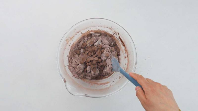 Die Milchschokoladendrops mit einem Spatel unterheben, bis sie gleichmäßig im Teig verteilt sind.