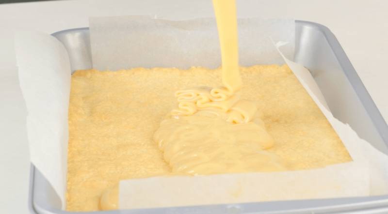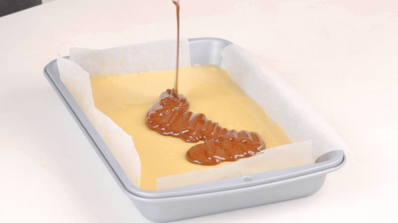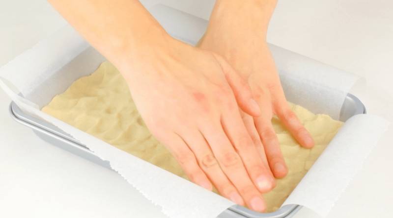 Heize deinen Backofen auf 175 °C vor. Lege die Backform auf beiden Seiten mit Pergamentpapier aus. Drücke den Teig gleichmäßig auf den Boden der Form. Backe den Kuchen 20–25 Minuten lang, bis der Boden goldbraun und fest ist. Lass ihn in der Form abkühlen.