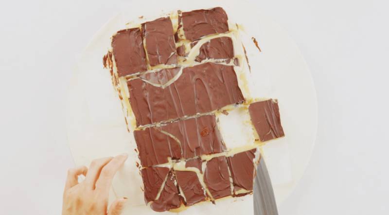 Sobald die Schokolade fest ist, das Dessert in Stücke schneiden und genießen!