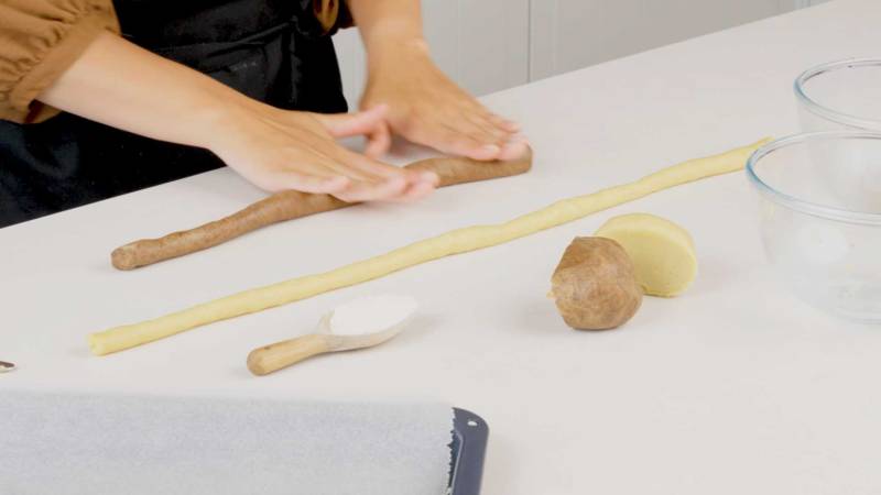 Teile den Vanille-Teig in zwei gleiche Portionen und rolle jede Portion zu einem Strang mit einem Durchmesser von 1 cm aus. Wiederhole den gleichen Vorgang mit dem Kakao-Teig.
