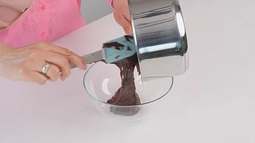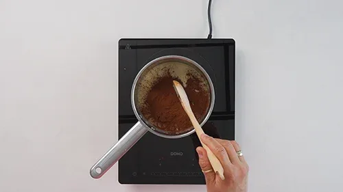 Continuez à remuer le mélange pendant environ 10 à 15 minutes, jusqu'à ce qu'il épaississe et commence à se détacher des parois de la casserole. Une fois que le mélange a atteint une consistance similaire à celle du fudge, retirez-le du feu et laissez-le refroidir légèrement.