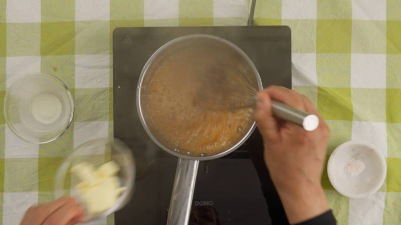 Faites fondre le sucre dans une casserole à feu moyen jusqu'à ce qu'il atteigne une belle couleur caramel. Une fois cela fait, ajoutez rapidement la crème et mélangez jusqu'à ce que le mélange redevienne lisse. Ajoutez le beurre et continuez à remuer jusqu'à ce que le tout soit bien homogène. Laissez le mélange refroidir avant de l'utiliser.