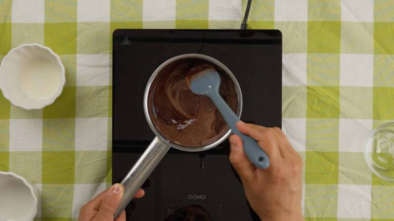 Arrêtez dès que la pâte atteint une consistance fluide, semblable à du miel. Pour vérifier, soulevez un peu de pâte avec la spatule : elle doit s’écouler en ruban et former un « 8 » en tombant. Dès que cette texture est obtenue, cessez immédiatement de mélanger.