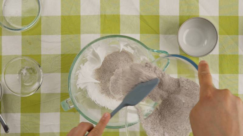 Incorporez un tiers du mélange d’amandes aux blancs d'œufs. Mélangez délicatement en soulevant la pâte, puis ajoutez le reste des ingrédients secs en trois fois. Veillez à ne pas mélanger ni remuer.