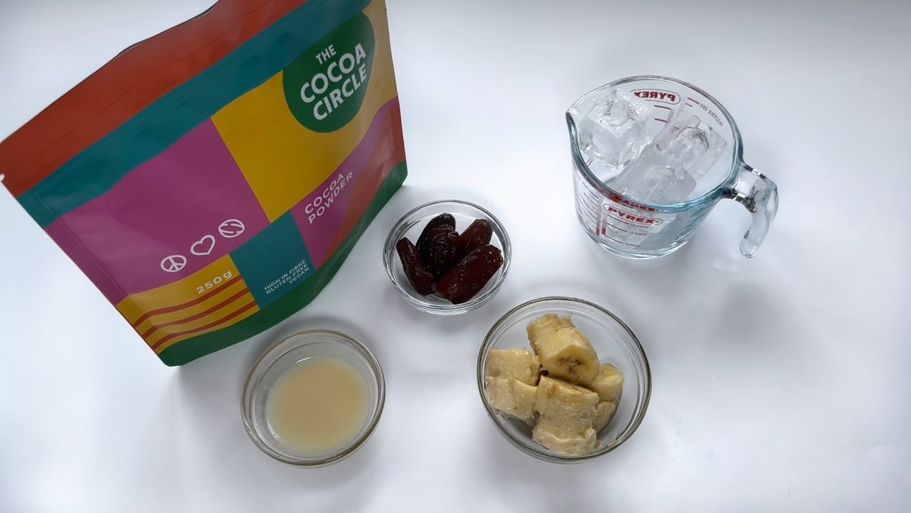 Placez la banane congelée, les glaçons, le lait de coco léger en conserve, le cacao en poudre, les dattes et l'extrait de vanille (si vous en utilisez) dans un mixeur.Mixez jusqu'à ce que le mélange soit lisse.