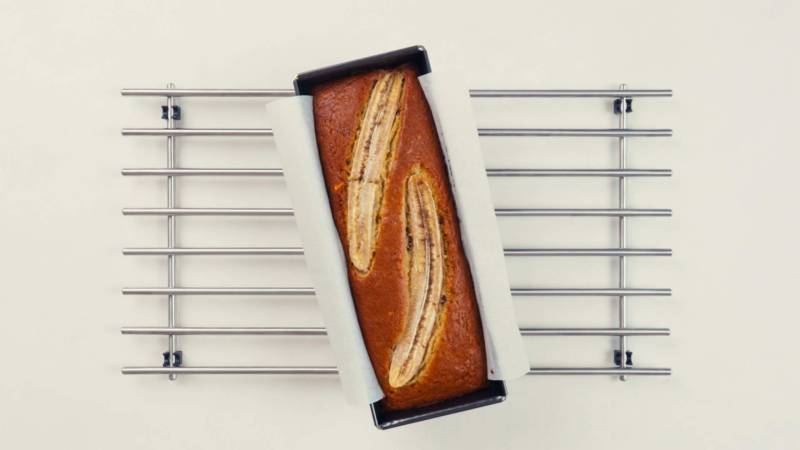 Giet het beslag in de voorbereide vorm en bak in de voorverwarmde oven gedurende ongeveer 50-65 minuten of totdat een houten prikker er schoon uitkomt. (Als je de extra banaan wilt gebruiken, snijd hem dan in de lengte doormidden en druk hem met de ronde kanten in het beslag.) Laat de cake 10 minuten afkoelen in de vorm.