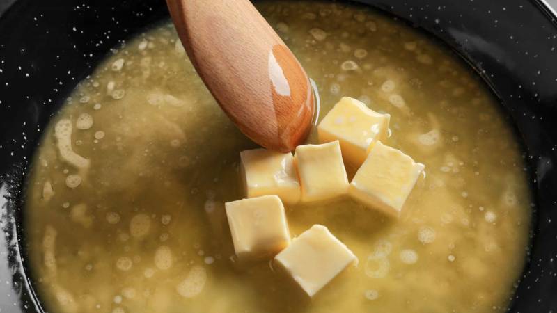 Smelt de boter in een kleine steelpan op laag vuur tot hij volledig gesmolten is. Zet opzij.