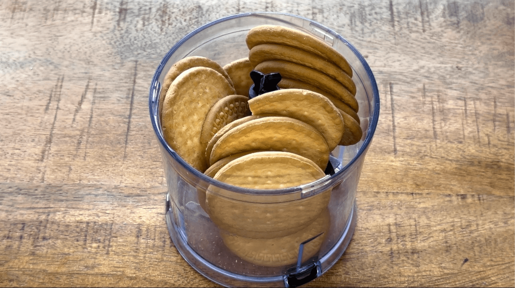 Doe de koekjes in een mixer en pulseer tot ze fijngehakt zijn. Doe de fijngehakte koekjes over in een grote mengkom.