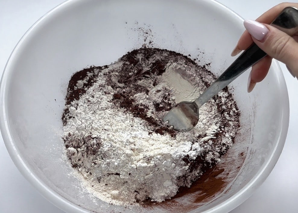 Combineer in een grote kom de bloem, cacao, bakpoeder, bruine suiker en een snufje zout. Gebruik een garde om eventuele klontjes suiker los te maken.Meng De Natte Ingrediënten