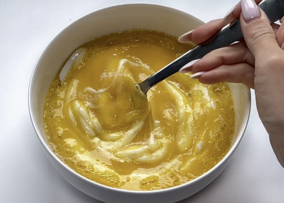 Giet de natte ingrediënten in de kom met droge ingrediënten. Klop totdat het beslag glad en goed gemengd is.