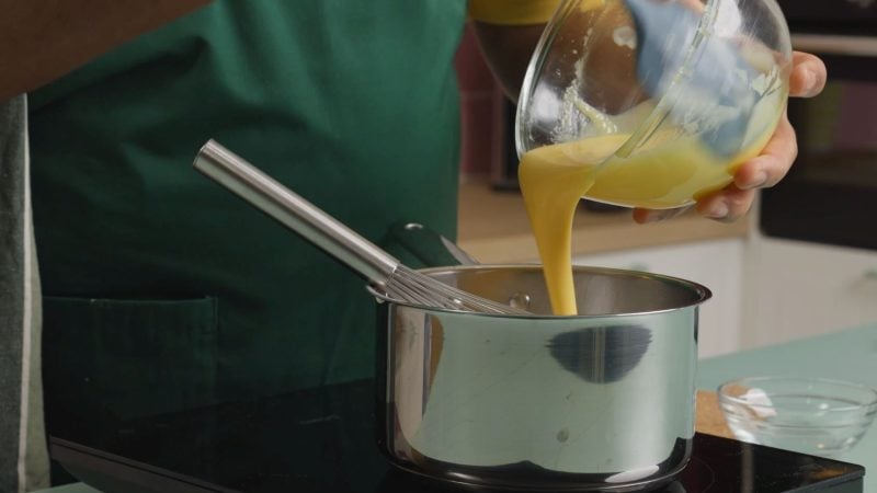 Klop langzaam een kleine hoeveelheid hete room door de dooiers en klop het mengsel dan terug in de steelpan.