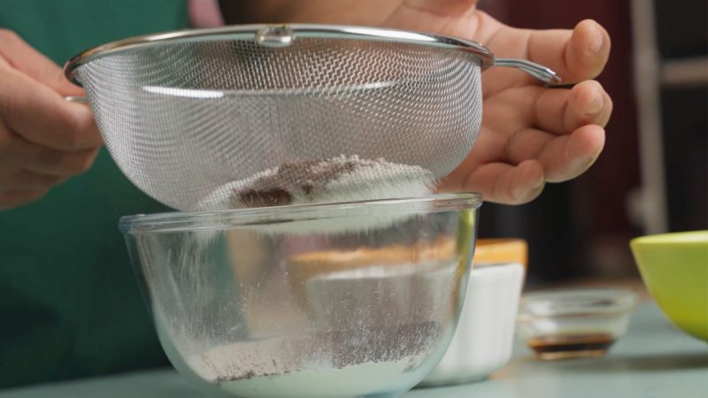 Zeef bloem, cacaopoeder, bakpoeder en zout.