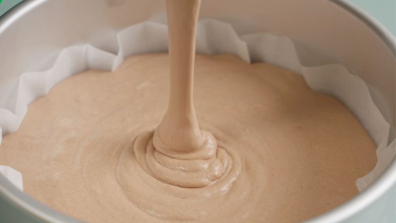 Spatel de droge ingrediënten door het eimengsel en voeg afwisselend de melk en gesmolten boter toe.