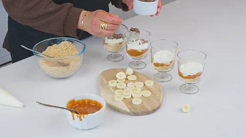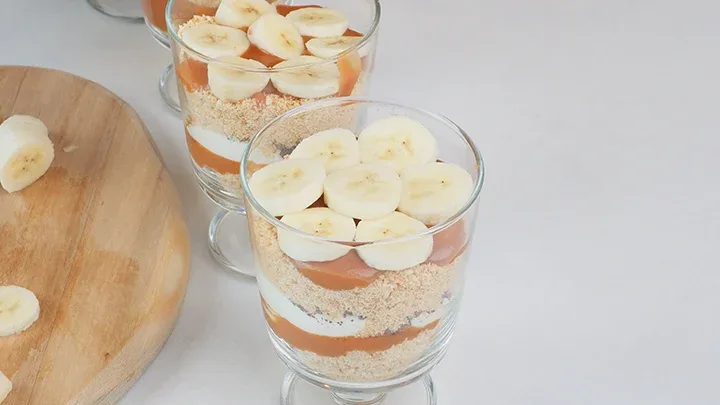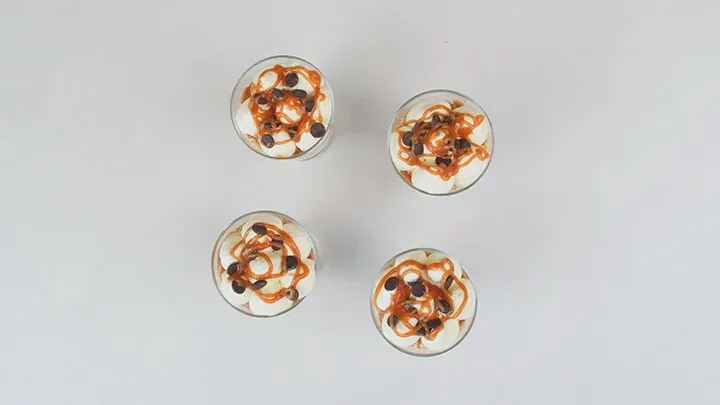 Serveer en geniet van deze heerlijke banoffee desserts in glazen als een verrukkelijke traktatie voor iedere gelegenheid!