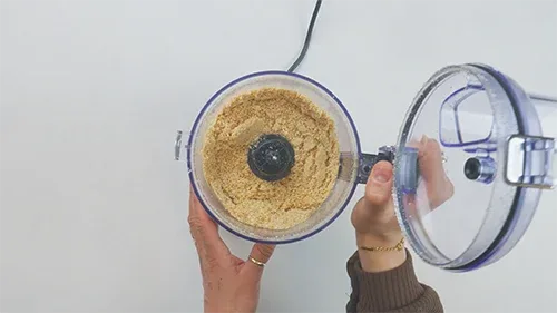 Maal de koekjes fijn met een keukenmachine of mixer. Meng in een aparte kom de koekkruimels met de gesmolten boter en 50 g kristalsuiker. Meng tot het goed gemengd is.