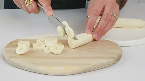 Snijd de bananen gelijkmatig in plakjes en zet aan de kant.