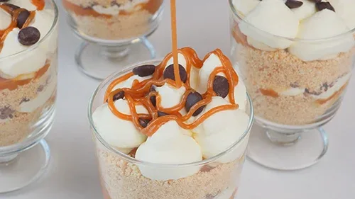 Doe de ingrediënten in de volgende volgorde in elk glas: 1. Biscuitkruimels 2. Karamelsaus Karamelsaus 3. In plakjes gesneden bananen 4. Roomkaasmengsel 5. Herhaal de lagen tot de glazen gevuld zijn en eindig met een toefje roomkaasmengsel bovenop.
