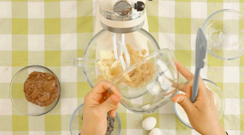 Verwarm de oven voor op 180°C. Meng in een kom alle ingrediënten voor de koekjes, behalve de chocoladepasta, tot je een deeg met grote kruimels krijgt.