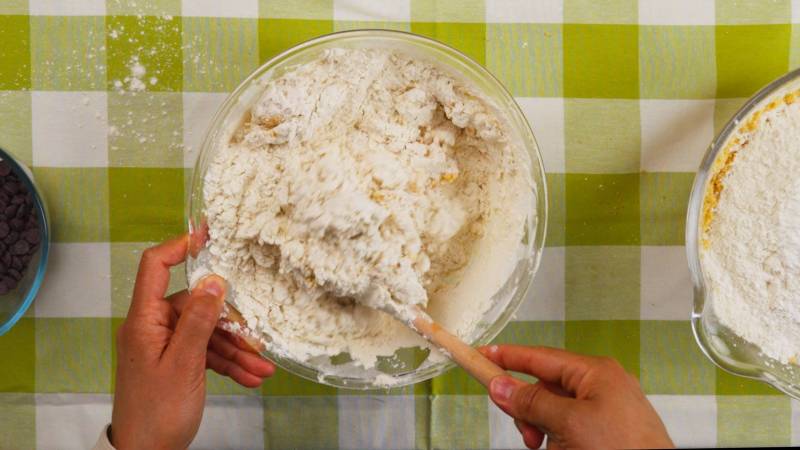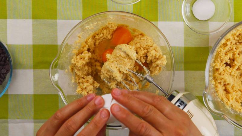 Chop the cranberries and pecans. Divide the batter into two large bowls. In one bowl, add the chocolate chips and pecans, and fold them in. In the other bowl, add the cranberries, white chocolate chips, and dark chocolate chips, and fold them in.