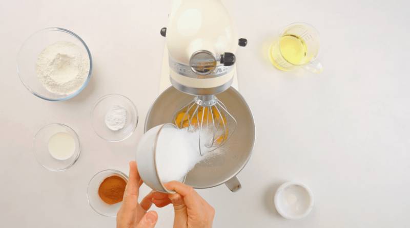 In a mixing bowl, beat the eggs, granulated sugar, vanilla sugar, and salt on medium-high speed for two minutes until creamy. Gradually pour in the sunflower oil and mix until fully absorbed. Sift the baking powder, flour, and cocoa powder together, then add to the batter and mix on low speed. Finally, mix in the milk.
