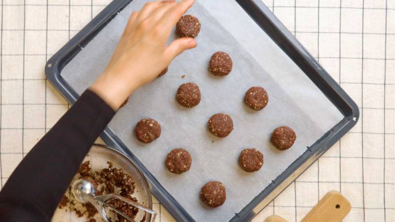 Scoop tablespoon-sized balls of dough onto the prepared baking sheet, leaving 1 inch of space between each macaroon. Shape each scoop into a ball and then flatten slightly into a disk shape.