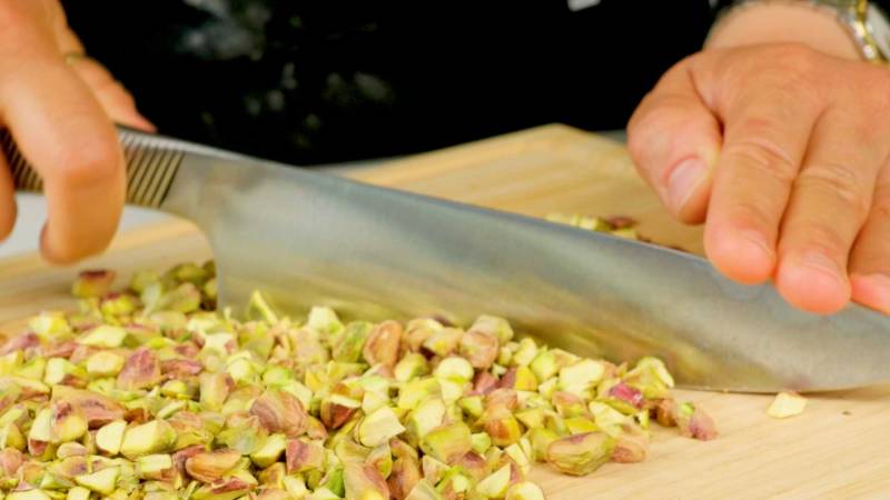 Preheat the oven to 180°C. Line a baking sheet with parchment paper or a nonstick baking mat. Coarsely chop the pistachios by hand or using a chopper. Process them into fine crumbs, reserving one tablespoon for topping.