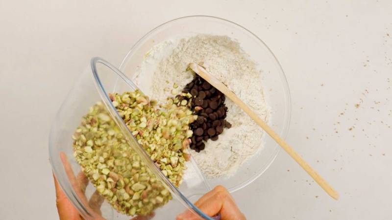 Gradually mix in flour, salt, and baking powder until just combined. Add chocolate chips and most of the chopped pistachios, folding them together with a spatula.