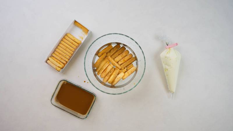 Spoon the cream into a piping bag. Dip the ladyfingers into the latte. Start with the dipped ladyfingers first. Finish with a layer of cream and sprinkle the tiramisu with cocoa powder.