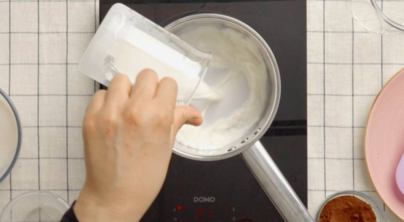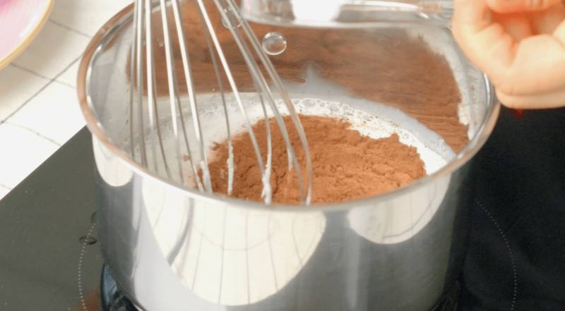 In a saucepan, combine the remaining cup of milk with the bloomed gelatin (powdered or softened sheets) and cocoa powder. Stir over medium heat until the gelatin is fully dissolved and the mixture is smooth. Do not boil; heat gently until just warmed through.
