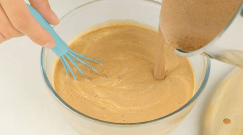 Slowly pour the chocolate cream into the egg mixture, stirring constantly to achieve a smooth blend.
