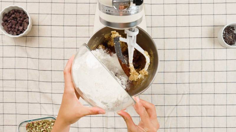 Gradually mix the flour, cocoa powder, salt, and baking soda.