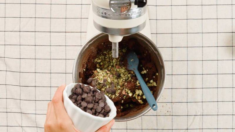 Fold in the dark chocolate drops and coarsely chopped pistachios until evenly distributed.