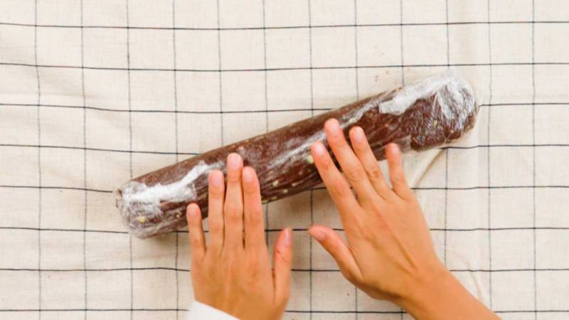 Roll the dough into a large log shape, wrap it in plastic wrap, and chill for at least 1 hour. The firmer the dough, the easier it will be to slice.