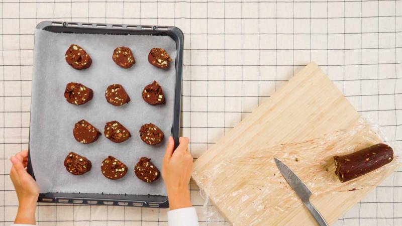 Preheat the oven to 175°C. Slice the chilled dough into 2 cm thick pieces and arrange them on a baking tray lined with parchment paper, ensuring sufficient space between the cookies.