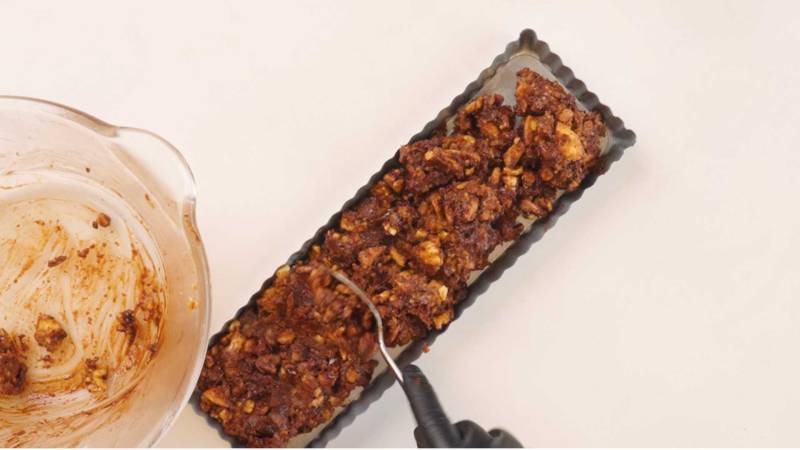 In a saucepan, melt the butter over low heat. Roughly chop the walnuts and crumble the biscuits into small pieces. Finely chop the pitted dates to ensure easy mixing.