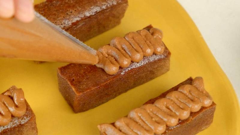 Carefully remove the financiers from their molds. Use a piping bag with a narrow nozzle to fill the center hole of each financier with creamy gianduja. Pipe a decorative swirl of the whipped ganache on top of each financier, creating an elegant and professional look.