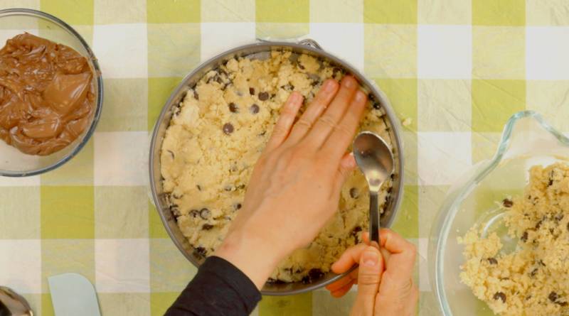 Spread half of the cookie dough with your hands in a pie pan approximately 24 cm in diameter. Spread the chocolate spread on top, then cover with the remaining dough. Bake for 30 minutes.