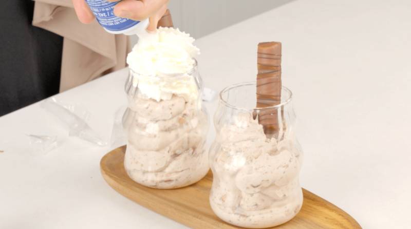 Decorate each glass with a dollop of whipped cream, a drizzle of chocolate sauce, and a piece of Kinder Bueno.