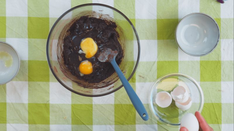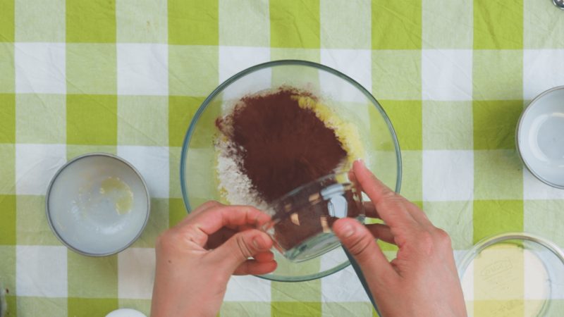 Mix melted butter, sugar, flour and cocoa together until smooth.