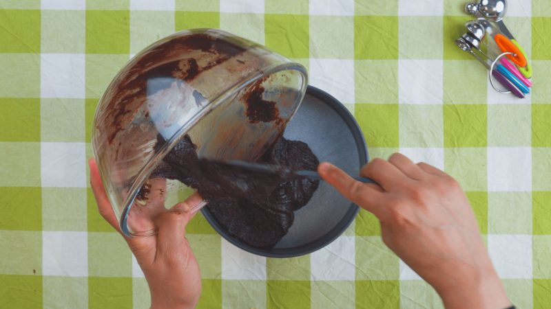 Pour the cake mixture into the prepared springform pan. Place the springform pan in the oven and bake for 29 to 35 minutes. For a soft and gooey cake, bake until just done; the longer it bakes, the more the batter will set.