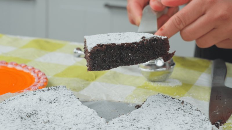 Let the cake cool completely in the pan. Once cooled, transfer the cake to a plate and sprinkle with icing sugar before serving.