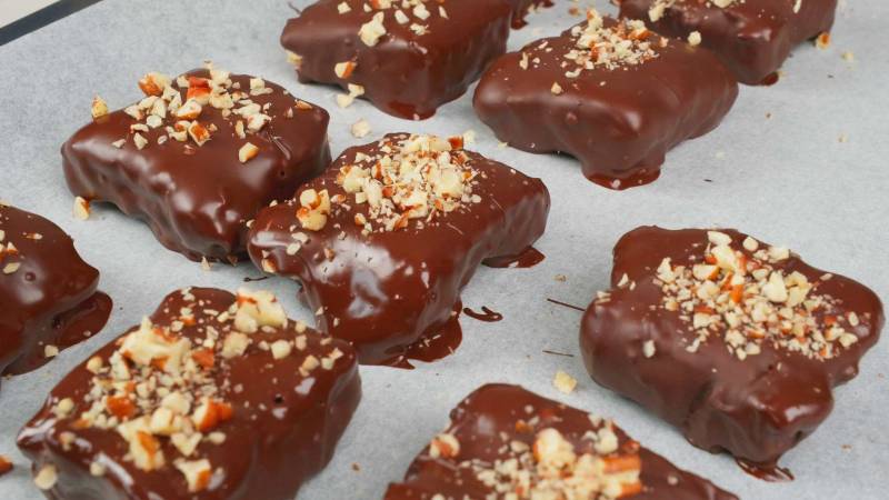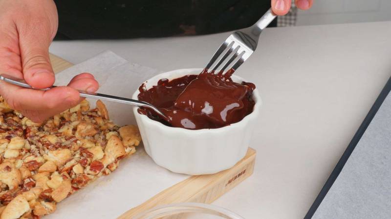 Place the dipped cookies on a baking sheet lined with parchment paper and decorate each cookie with chopped pecans. Place the cookies in the refrigerator for the chocolate to set.
